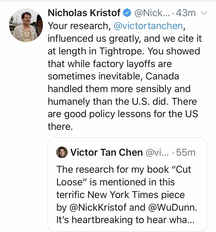 It’s an honor to be mentioned in these circles, and I’m heartened to hear people engaging with some of my ideas about grace—a perspective of compassion, acceptance, and nonjudgment that especially resonates during this time of crisis, I think. The morality of grace has a particularly prominent place in Kristof and WuDunn’s book, as mentioned in the Publishers Weekly review: “Kristof and WuDunn avoid pity while creating empathy for their subjects, and effectively advocate for a ‘morality of grace’ to which readers should hold policy makers accountable.” Hopefully, this crisis will inspire both soul-searching and action.